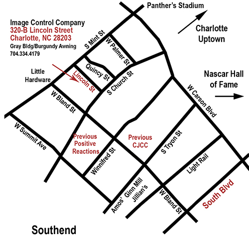 From East Interstate 74 (Independence Blvd): Take 74 West towards uptown Charlotte. Merge on to Interstate 277/John Belk Frwy. Take third exit, Exit 1E, for South Blvd. At light, take left onto South Blvd. Go to second light and take a right on Bland St. Cross over Tryon St. and go two blocks, turn right on Church Street, take immediate first left on Lincoln St. Gray building on right with burgundy awning.